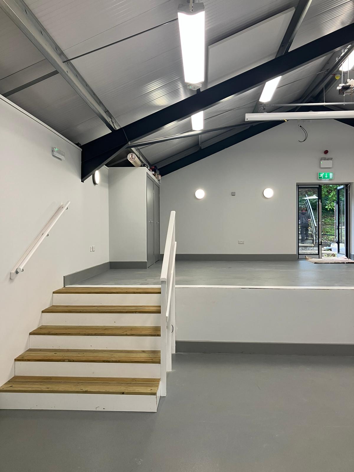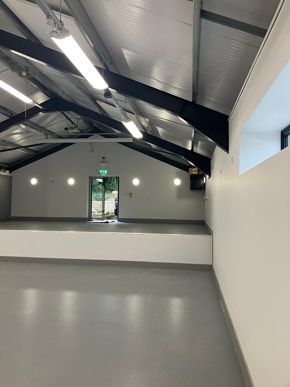 The scope of work involved asbestos removal and the demolition of the existing school hall, as well as groundwork and foundation pad preparation to facilitate the installation of the new steelwork frame, external cladding, doors, and windows. Internal refurbishment tasks encompassed acoustic panel installation, underfloor heating implementation and decorative enhancements.