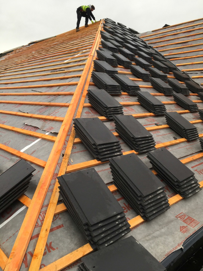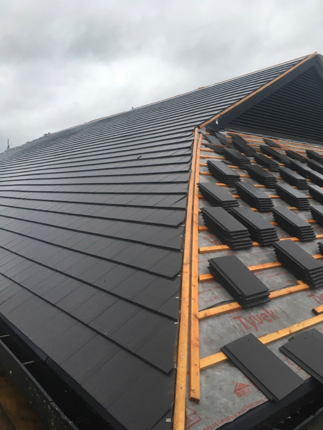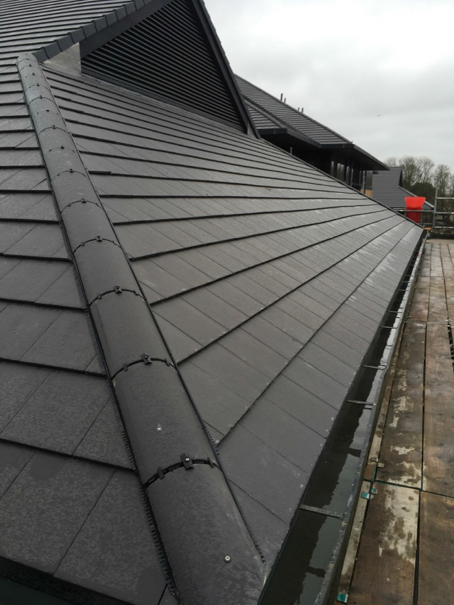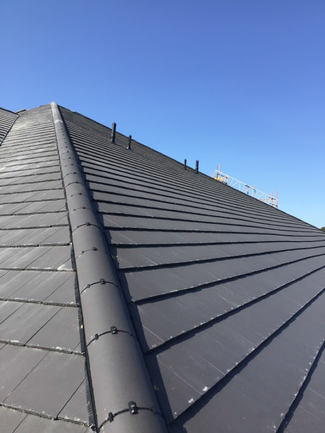 The scope included removal of all existing roof coverings, design and erection of full perimeter scaffolding, and the supply and installation of a new interlocking concrete tile roofing system, in line with Building Regulations Part L (insulation) and Part F (ventilation).